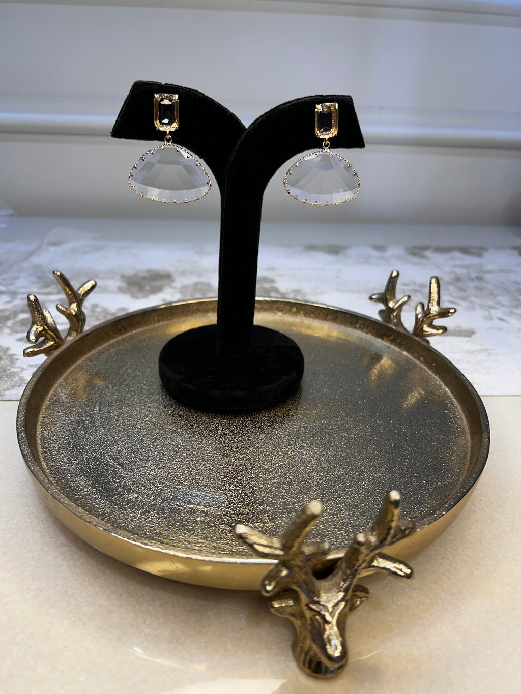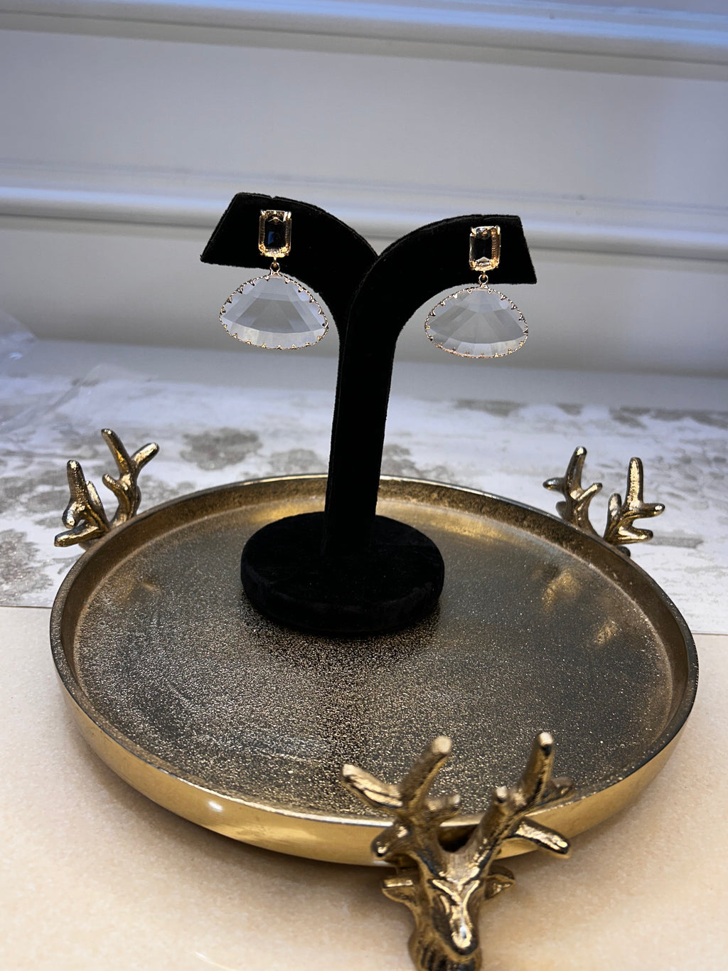 Semi Triangle Clear Crystal Earring Danglers with gold outlining finish can be teamed up with gowns and dress of your choice